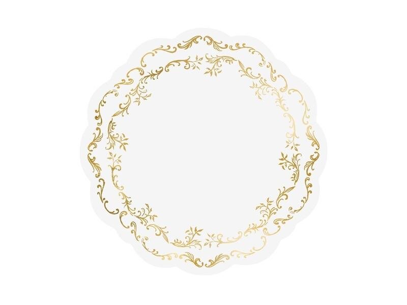 Jednostronne podkładki pod talerze w kolorze białym ze złotym Ornamentem. Średnica ok. 35,5 cm. Zestaw zawiera 6 podkładek. Produkt jednorazowego użytku. Wykonane z wodoodpornego syntetycznego papieru.(1 op. / 6 szt.) przeczytaj całość