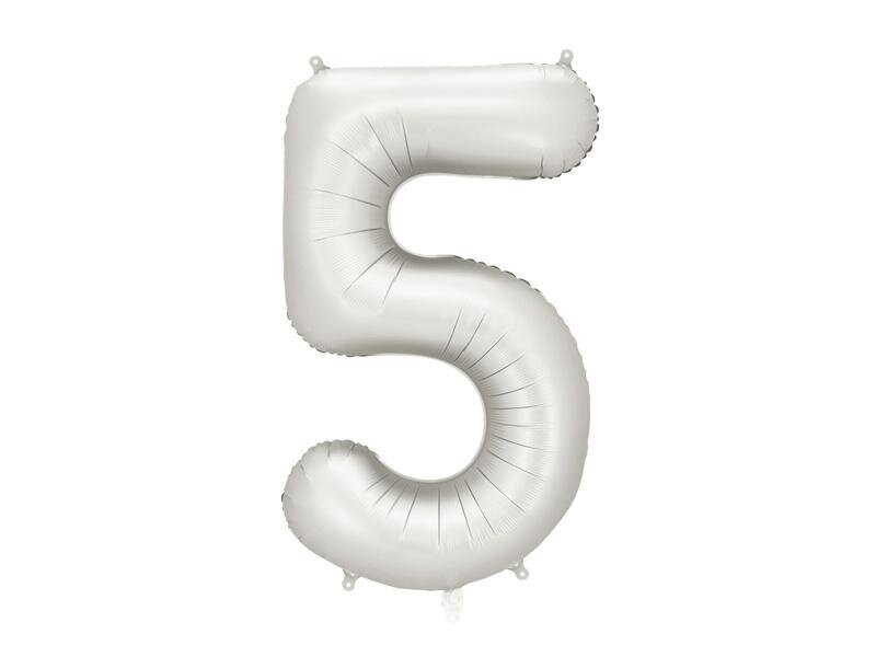 Balon foliowy satynowy Cyfra 5 w kolorze srebrnym, rozmiar przed napompowaniem ok. 100 cm (39''), rozmiar po napompowaniu ok. 86 cm (34''). Do napompowania powietrzem i helem. Zestaw zawiera słomkę. Balon jest samouszczelniający się. Posiada haczyki ułatwiające montaż balona do dekoracji. przeczytaj całość
