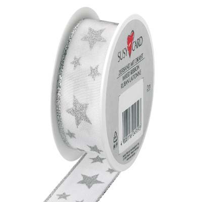 Stříbrná stuha s glitrem v motivu hveždiček 2,5 cm x 2 m Skvěle se hodí v Vánoční i slavnostní výzdobě. przeczytaj całość