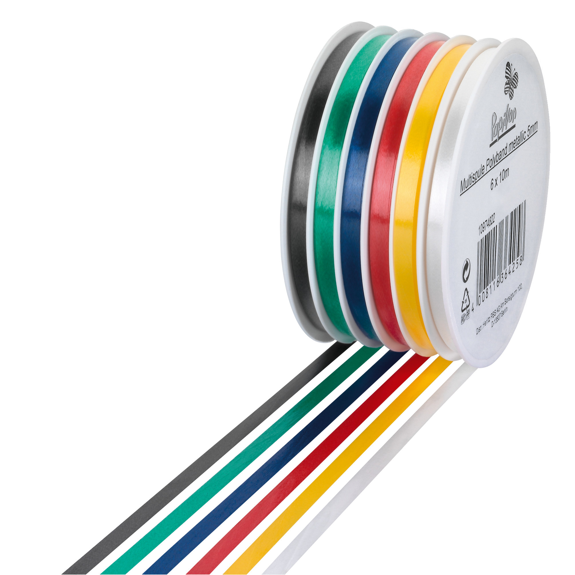 Stuha dárková 10 m x 5 mm, 6 barev na jedné cívce, žlutá, červená, modrá, zelená, hnědá przeczytaj całość