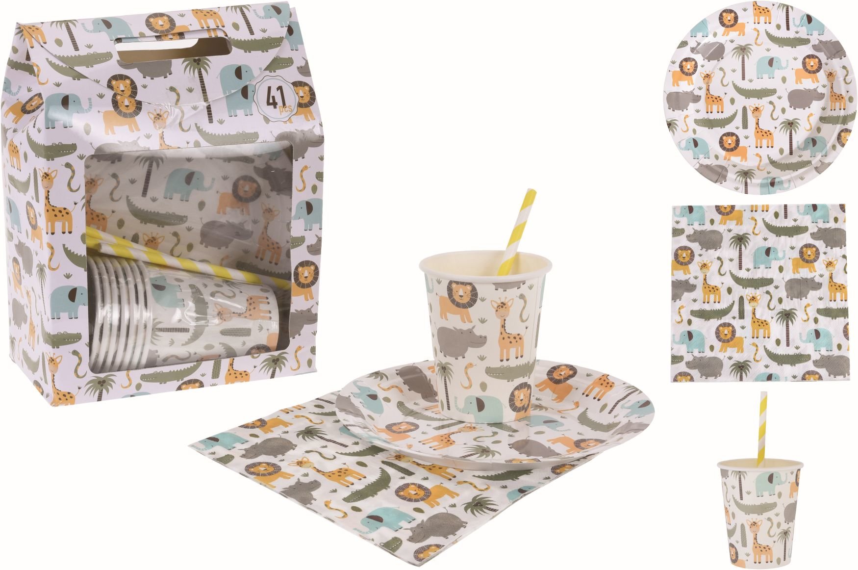 41 dílný papírový dětský set na párty - 8x kelímek 250ml, 8x talíř 17,5cm, 8x papírové brčko 14cm, 16x ubrousek 33x33cm, 1x ubrus 180x130cm. przeczytaj całość