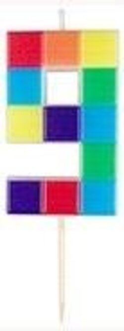 Świeczka urodzinowa w kształcie cyfry 9 z motywem kolorowych klocków. Idealna jako dopełnienie dekoracji tortu. Posiada element umożliwiający stabilne wbicie świeczki w ciasto. Wysokość świeczki to 7 cm. przeczytaj całość