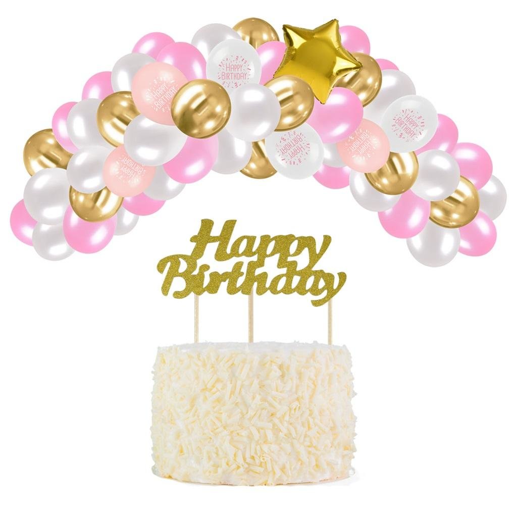 Zestaw dekoracji urodzinowych składający się aż z 53 elementów. To kompletna aranżacja imprezy urodzinowej dla dziewczynki lub fanów połączenia różu ze złotem. W zestawie: - 34 balony lateksowe w kolorach różowym (x17) i białym (x17), wielkości 25 cm - 6 balonów lateksowych z nadrukiem napisu...