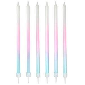 Wysokie świeczki urodzinowe w modnym wzorze ombre. Stanowią elegancką dekorację tortów i ciast urodzinowych. Świeczki w pastelowych odcieniach z przejściem kolorów z niebieskiego poprzez różowy do bieli. Wyposażone w podstawki umożliwiające stabilne i łatwe umieszczenie świeczki na torcie.... przeczytaj całość