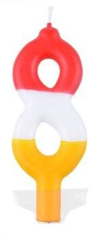 Świeczka urodzinowa w kształcie cyferki wykonana z trójkolorowego wosku: czerwonego, białego i żółtego. Wysokość świeczki 10,5 cm. przeczytaj całość