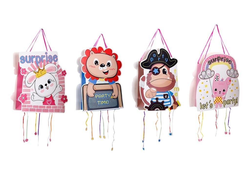 Mix wzorów, towra wysyłany losowo.Torebka Piniata z wstążkami to innowacyjny produkt, który zapewni niezapomniane chwile zabawy na każdej imprezie. Wyposażona w wstążkowy uchwyt, ta torebka jest łatwa do przenoszenia i zawieszenia. Jednak prawdziwą atrakcją jest możliwość pociągnięcia za wstążki,...
