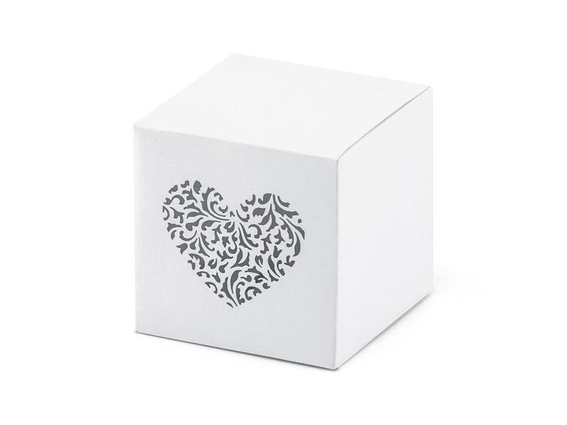 Białe pudełko z serduszkiem, które można użyć na przykład na prezenty dla gości weselnych lub na drobne słodkości z poczęstunku Wymiary: 5 x 5 x 5 cm. Ilość: 10 szt. przeczytaj całość