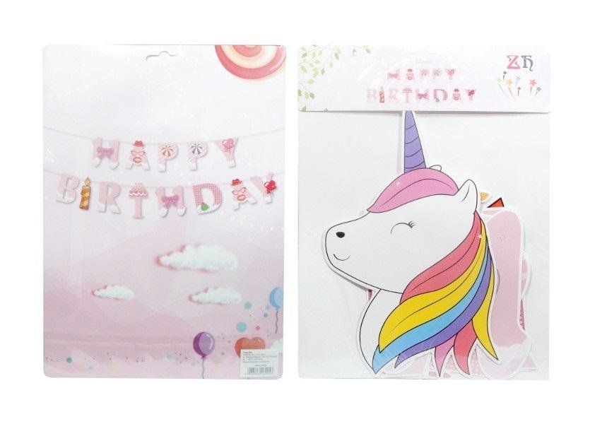 Jednostronna, papierowa, ozdobna girlanda z napisem Happy Birthday z jednorożcem (do samodzielnego złożenia). Produkt zapakowany w przezroczysty worek. Podane wymiary są wymiarami opakowania. przeczytaj całość