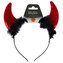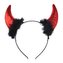 Czerwone, błyszczące rogi wykonane z materiału o metalicznym połysku osadzone na opasce. W miejscu łączenia rogu z opaską zostało dodane ozdobne wykończenie z czarnych delikatnych piórek. Element kostiumu na halloween, bal karnawałowy bądź samodzielny gadżet. Rozmiar opaski to 21 cm. przeczytaj całość