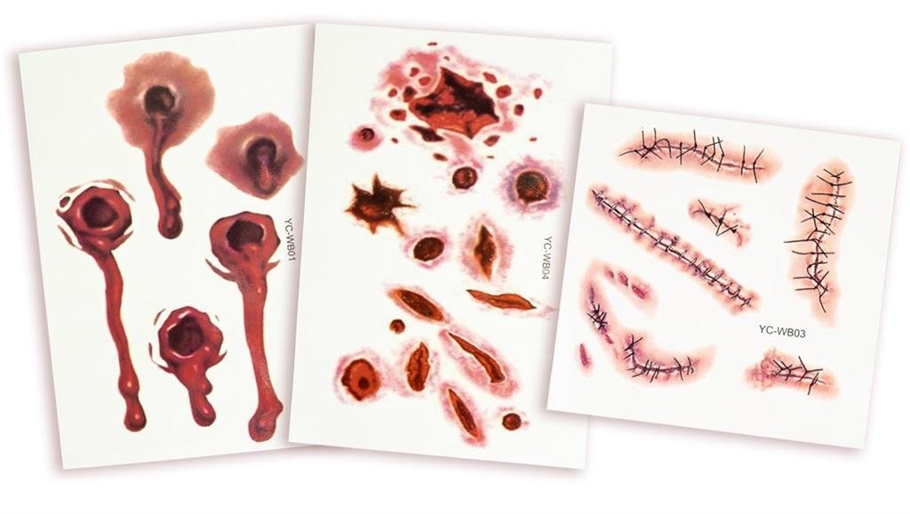 Zestaw tatuaży do charakteryzacji na Halloween, imprezę tematyczną, bal przebierańców. Tatuaże ze wzorami ran otwartych, zszytych, postrzałowych. Straszne tatuaże, idealne do charakteryzacji postaci zombie, potwora. Produkt tymczasowy, zmywalny, bezpieczny w użyciu. Tatuaże na blistrze o wymiarze... przeczytaj całość