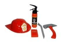 Zestaw strażacki dla małego strażaka. Z takim zestawem można przystąpić do zabawy. Zabawka zawiera m.in.: kask, toporek, gaśnicę, krótkofalówkę, odznakę#&Całość zapakowana jest w worek z siateczki.#&Podane wymiary są wymiarami produktu w opakowaniu przeczytaj całość