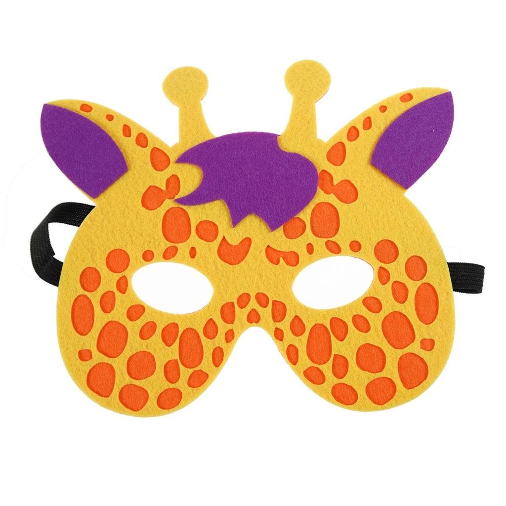 Maska dziecięca wykonana z grubego filcu w kształcie głowy żyrafy. Maska posiada wycięte otwory na oczy oraz przestrzeń w okolicy nosa umożliwiając wygodne noszenie. Wyposażona została w elastyczną gumkę zapewniającą komfortowe zakładanie oraz zdejmowanie maski. Doskonała jako uzupełnienie stylizacji, przebrania na urodziny, teatrzyki, bale przebierańców.