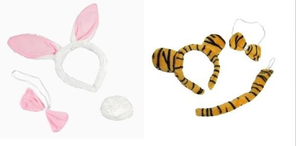 Komplet z motywem zwierzaków wykonany z miękkiego materiału. W zestawie opaska z uszami,ogonek oraz muszkę na gumce. Wymiary: opaska 14x13 cm, ogonek 25 cm, muszka 10,5 cm. Wzór: tygrys lub królik przeczytaj całość