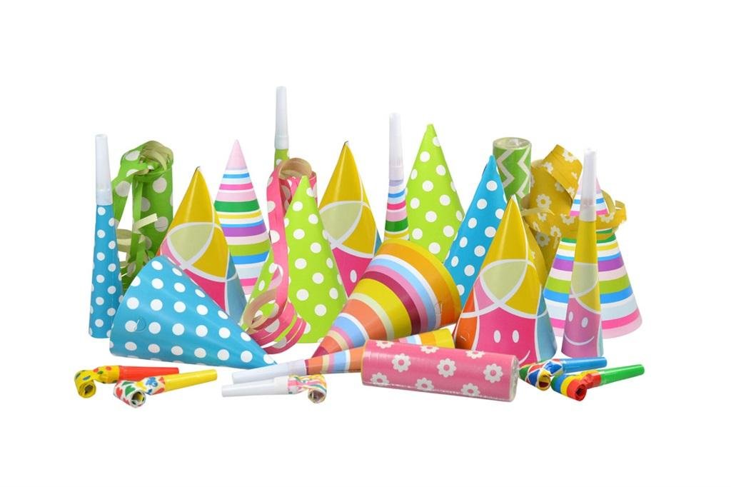 Gadżety imprezowe o wymiarach: czapeczka 16 cm średnica 10 cm, trąbka 19 cm, gwizdek 9 cm (rozwinięty 2,5x35 cm), serpentyny 18 krążków. przeczytaj całość