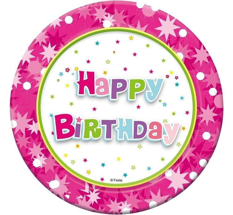 TALERZYKI "HAPPY BIRTHDAY"Średnica: 18 cmIlość sztuk w opakowaniu: 6Kolor: różowyMateriał: papierPapierowe talerzyki z napisem "Happy Birthday". przeczytaj całość