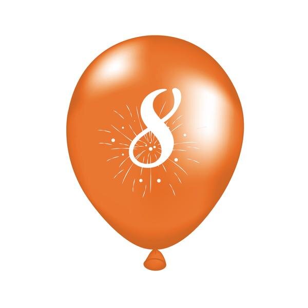 Party balónky s potiskem číslice "8" jsou vhodné na oslavu narozenin či různých výročí. Balení obsahuje 5 ks balónků (2x oranžový, 2x zelený, 1x žlutý o rozměru cca 25 cm (po nafouknutí). Balónky nafukujte pouze do přiměřeného rozměru. Manipulace dětí s balónky by měla probíhat pouze pod dozorem dospělé osoby. Skladujte při teplotách nad 10°C. Vyrobeno z přírodního latexu.