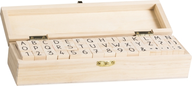 Dřevěná razítka abeceda, číslice a znaky. Rozměr boxu 23x6,5x5 cm. przeczytaj całość