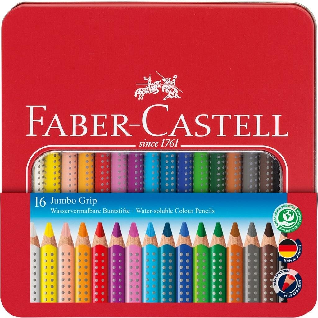 Kredki Jumbo Grip Faber-Castell 16 szt. w opakowaniu metalowym. Doskonałe do wielu technik artystycznych, dla hobbystów i dzieci. W większym rozmiarze Jumbo. Zachwycają żywymi i intensywnymi kolorami. Posiadają wysokiej jakości rozpuszczalny w wodzie pigment, umożliwiający osiągnięcie efektu jak przy wykorzystaniu tradycyjnych akwareli. To gwarancja fantastycznych rezultatów i doskonałej zabawy. Wystarczy kilka ruchów wilgotnym pędzlem po narysowanym wzorze, by wydobyć wyjątkowy efekt obrazu akwarelowego. Wyjątkowo gładkie i miękkie w aplikacji. Ergonomiczny trójkątny kształt i charakterystyczna dla tej serii opatentowana strefa Grip z małymi, antypoślizgowymi punktami zapewniają wysoki komfort użytkowania i niemęczące, wygodne rysowanie. Odpowiednie również dla leworęcznych. Kolory spieralne z większości tkanin. Grafity są wysoko odporny na pękanie, dzięki bezpiecznemu procesowi wiązania (SV). Wykonane z certyfikowanego drewna pochodzącego ze zrównoważonego i odpowiedzialnie zarządzanego leśnictwa. Powierzchnie pokryte lakierem na bazie wody bezpiecznym dla środowiska i zdrowia dzieci. Dostępne w różnych kolorach i różnych zestawach.