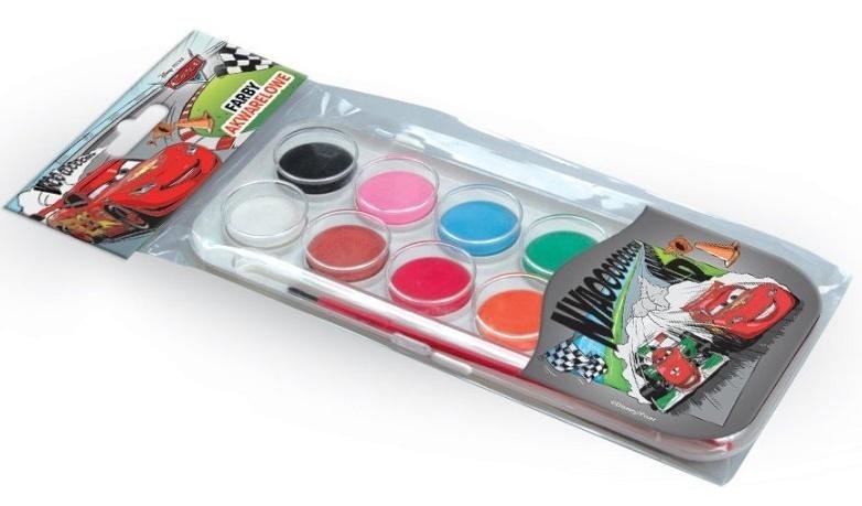 Farbki akwarelowe 12 kolorów. Umieszczone w plastikowym pudełeczku, zawierającym również pędzelek (rączka wykonana z plastiku). Farbki w formie "guziczków" o średnicy 2,8 cm. Pudełeczko łatwo zamykane - typu płaska kasetka, wieczko przezroczyste, podstawa jednolity kolor. przeczytaj całość