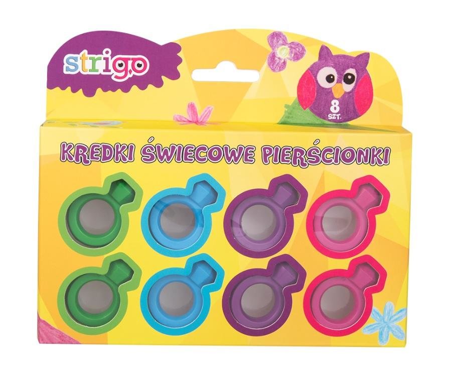 Do kolekcji kredek Strigo, piszących całą powierzchnią, dołączyły Pierścionki z ,,brylantem". Kredki można nałożyć na palec lub chwycić palcami - i rysować! Każdy rodzaj kredek ćwiczy inne ruchy dłoni najmłodszych, wszystkie natomiast, ze względu na swoje ciekawe, niezwykłe kształty spotkają się z zainteresowaniem najmłodszych testerów. Kredki dostępne są w 4 głębokich kolorach.