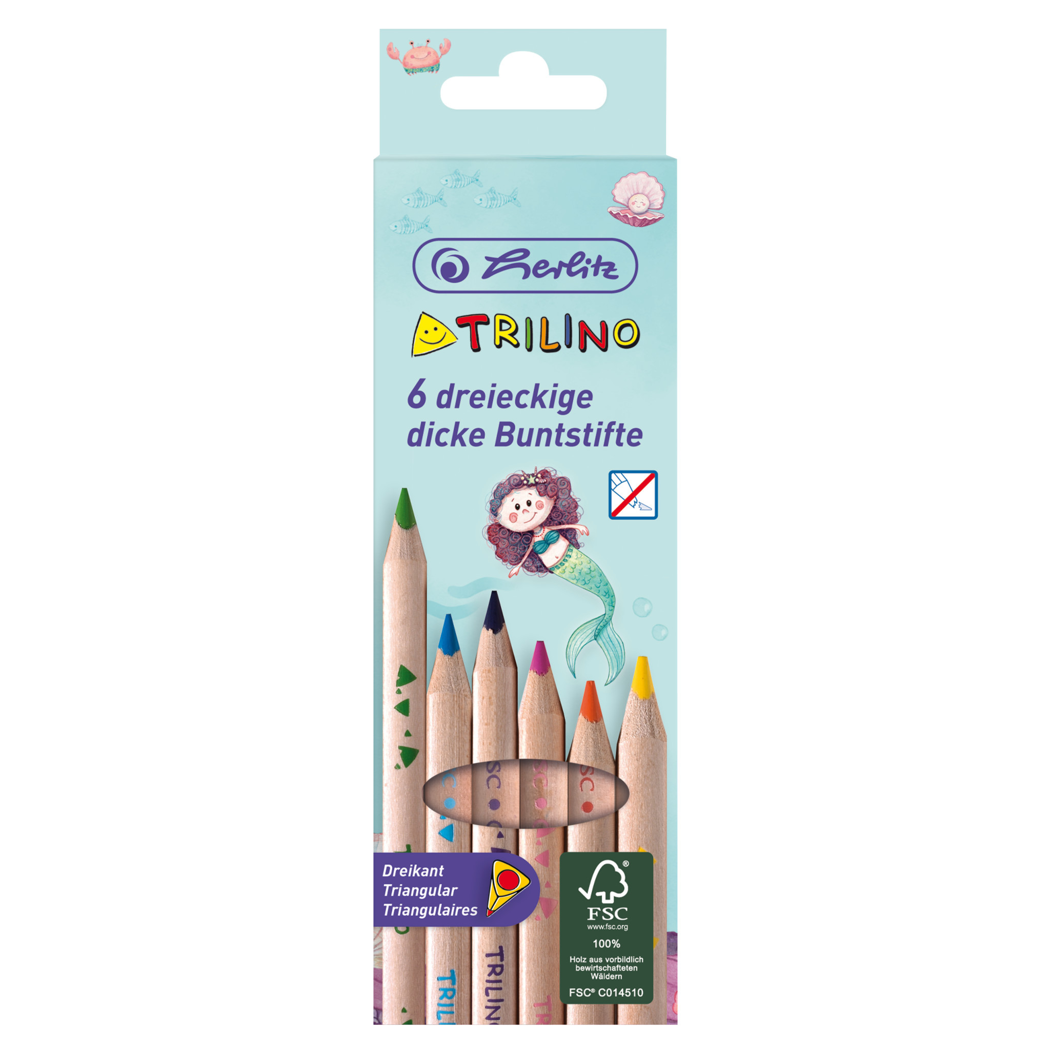 pastelek Trilino, dřevo, zodpovědně získávané, jumbo, trojúhelníkový tvar, průměr tuhy 5 mm, s tuhou odolnou proti zlomení, v závěsném balení s motivem Mořské panny, barvy: žlutá, oranžová, růžová, fialová, světle modrá, světle zelená przeczytaj całość
