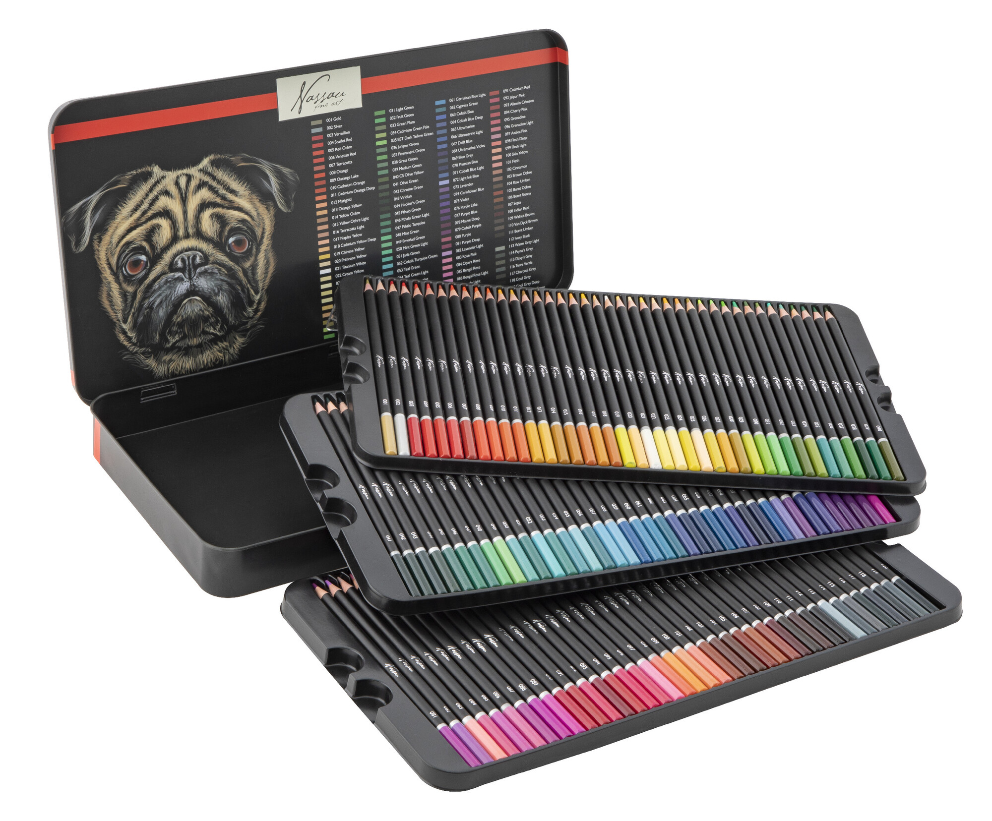 Zawiera: 120 kolorowych kredek w metalowym pudełku, ponumerowanych, ułożonych w trzech warstwach i oznaczonych kolorystycznie, aby umożliwić natychmiastowe rozpoznanie konkretnego koloru.