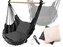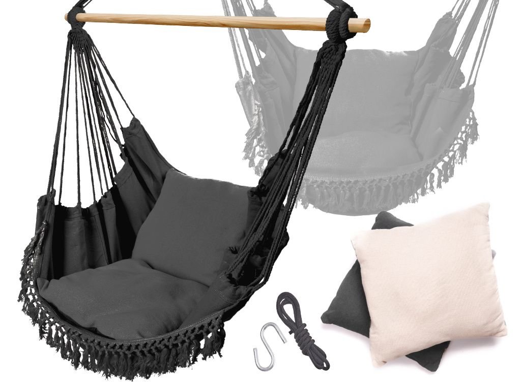 Brazilské závěsné houpací křeslo černé s třásněmi, dřevěnou tyčí a polštáři