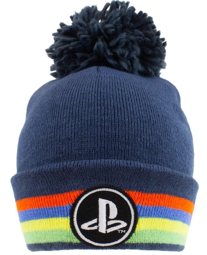 Modrá přeložená zimní čepice s bambulí, barevnými proužky a logem PlayStation.