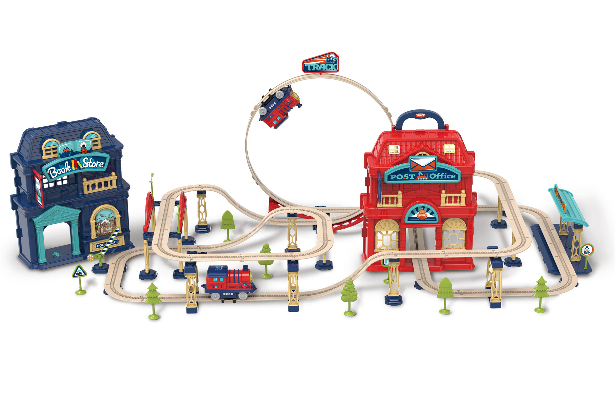 Vlaková dráha v kufříku 142 dílků. Rozměry 110x46x36,5 cm. 2xAAA baterie do mašinky nejsou součástí. Komínek mašinky slouží jako tlačítko ON/OFF. Obsah - dráha, mašinka, 2 budovy, zastávka, most, závora, značka, stromy, světla. Obrázkový návod na sestavení na vnitřní straně obalové karty. przeczytaj całość