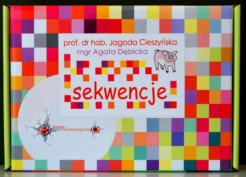 Zestaw zawiera 80 kartoników. Dziesięć wzorów po osiem sztuk. Cztery obrazki (koń, świnka, kura i krowa) stanowią materiał tematyczny. Pięć pozostałych (słońce, księżyc, kwadrat oraz kropki w trzech wielkościach) to materiał atematyczny (symboliczny). Sekwencja jest ciągiem znaków (symboli),...