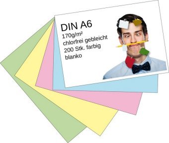 - Karteikarten 200 Stück A6 blanko farbig sortiert (5 Farben je 40 Stück) sehr praktisch für eigene Einträge wie zum Beispiel Telefonnummern, Adressen usw. - Format DIN A6, 10,5 x 14,8 cm (Höhe x Breite) - Farben: weiß, desert-gelb, coral-rosa, eisblau, forest-grün (waldgrün) - Lineatur blanko - Grammatur 160 g farbiges Papier, 170 g weißes Papier - FCS- und PEFC-zertifiziert - 100% chlorfrei gebleicht Weitere Karteikarten, die Sie auch interessieren könnten: - Formate DIN A8, DIN A7, DIN A6 - Lineaturen blanko, kariert, liniert - Verpackungseinheiten á 200 Karten, 500 Karten, 1000 Karten, 2000 Karten