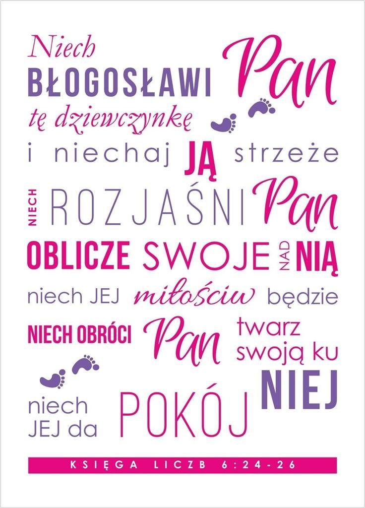 Niech błogosławi Pan tę dziewczynkę i niechaj ją strzeże. Niech rozjaśni Pan oblicze swoje nad nią, niech jej miłościw będzie. Niech obróci Pan twarz swoją ku niej, niech jej da pokój.Kartka okolicznościowa składana z kopertą.Format: C6 (114x162)Tekst w środku: brak przeczytaj całość