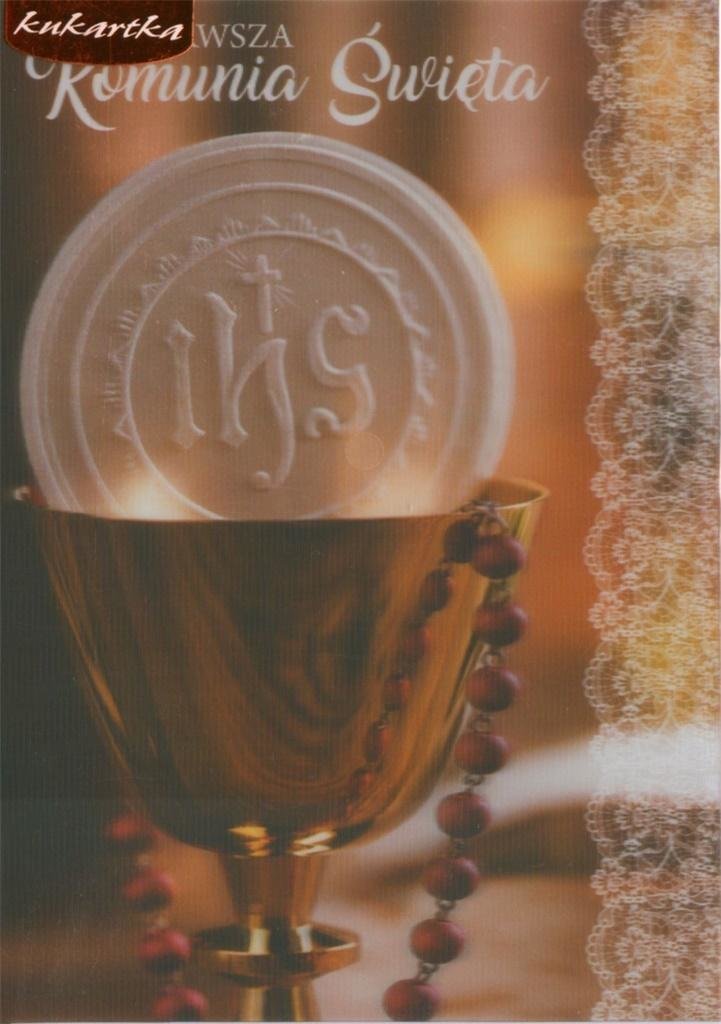 Kartka z efektem trójwymiarowym - dzięki specjalnej technologii, obrazek na kartce wydaje się ruszać pod różnym kątem. Cechy szczególne: wymiary: B6, 16.6 x 11.7 cm po złożeniu zdobienie: trójwymiarowy efekt okazja: Komunia środek: kolorowy, życzenia w środku przeczytaj całość