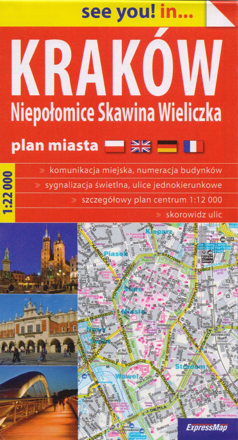 Plan miasta Kraków i okolic (Niepołomice, Skawina, Wieliczka) w skali 1:22000. komunikacja miejska, numeracja budynków, sygnalizacja świetlna, ulice jednokierunkowe, szczegółowy plan centrum w skali 1:12 000, skorowidz ulic.. przeczytaj całość