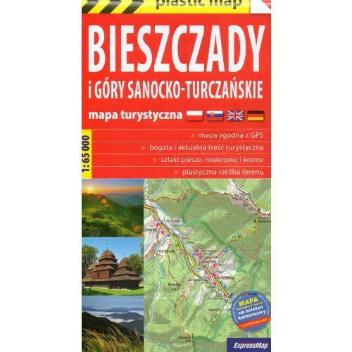 Wodoodporna, dwustronnie foliowana mapa turystyczna Bieszczad oraz Gór Sanocko-Turczańskich, w wygodnej dla turystów podziałce 1:65 000, przydatna na szlaku i podczas zwiedzania, opracowana przez doświadczonych kartografów we współpracy z krajoznawcami z tych terenów. Na mapie: - trasy...