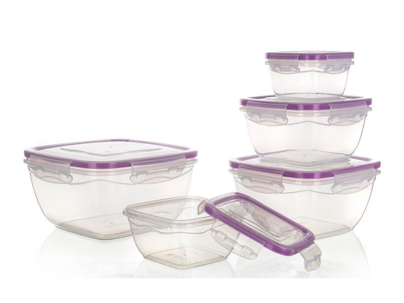 - Obsahuje čtvercové dózy o objemu 0,275 + 0,5 + 0,9 + 1,5 + 2,4 l