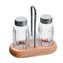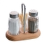 Zestaw do przypraw - solniczka i pieprzniczka w stojaku z pojemnikiem na wykałaczki. Materiał: szkło, stal nierdzewna, drewno. Wymiary: 12x6x10 cm. przeczytaj całość