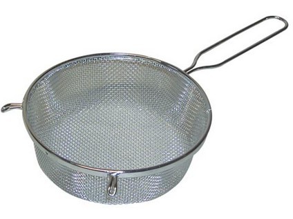 Průměr: 18 cmHloubka: 6 cmOčka síta: 2 x 2 mmKoš na smažení pomfritů. Vyroben z ocelového pomfritového tkaniva s oky, plechu na obrubě a drátu. Držadlo má háčky pro případné zavěšení nebo zachycení jak ve fritovacím hrnci tak na dřezu při cedění. Galvanicky leskle pokoveno. przeczytaj całość