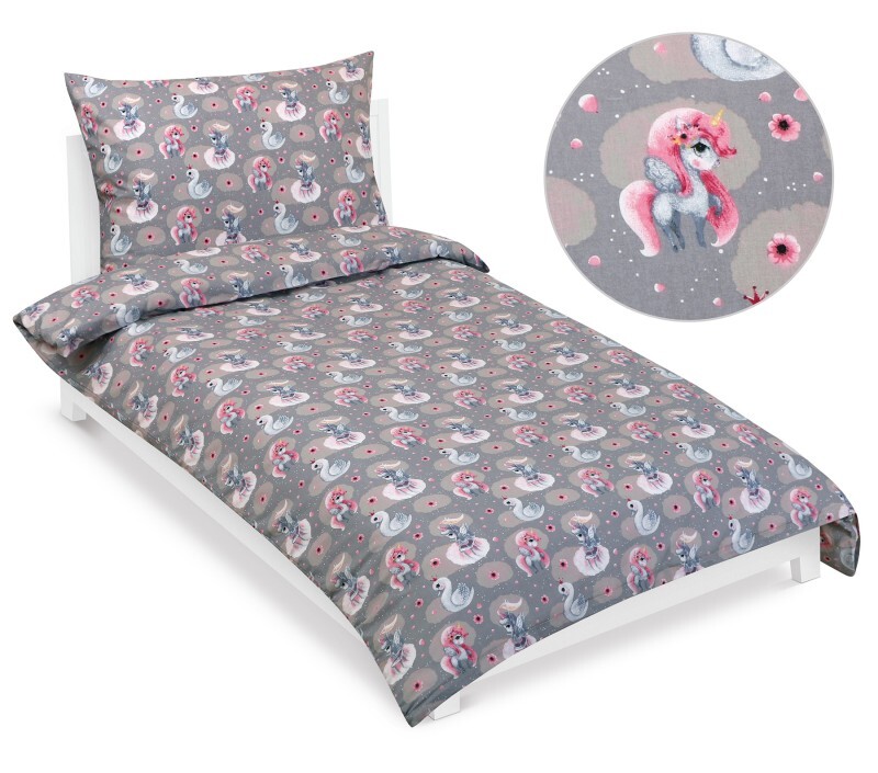 Povlečení bavlněné Junior - Jednorožec, labuť šedá, růžová - 140x200, 70x90 cm