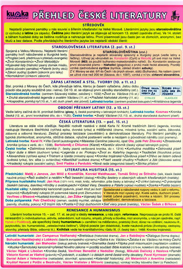 Literatura od pierwszych czeskich pism aż po współczesne dzieła, odpowiednia dla uczniów szkół podstawowych i średnich. Przegląd zawiera między innymi wszystkich znaczących czeskich pisarzy, omówienie głównych kierunków literackich, rozdziały: proza, poezja i dramat, 13 ilustracji graficznych. przeczytaj całość