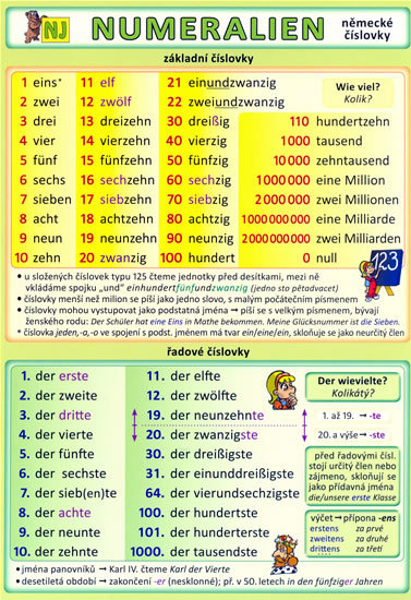 Kompleksowy przegląd niemieckich liczebników, który pomoże opanować gramatykę wszystkim małym i dużym uczniom. Zawiera liczebniki główne, porządkowe, wielokrotne i zbiorowe, ułamki, liczenie, liczby dziesiętne, daty, lata, określanie czasu. Ilustracje autorstwa Petra Kopla. przeczytaj całość