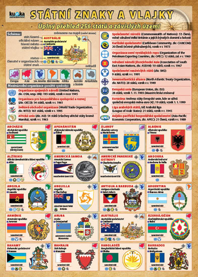 Pełny przegląd godłów i flag 256 państw i terytoriów zależnych. Przy każdym państwie podano ponadto oficjalną nazwę, stolicę, status, członkostwo w organizacjach międzynarodowych oraz kontynent, na którym się znajduje. Na odwrocie znajdują się mapki obszaru karaibskiego i Pacyfiku. przeczytaj całość