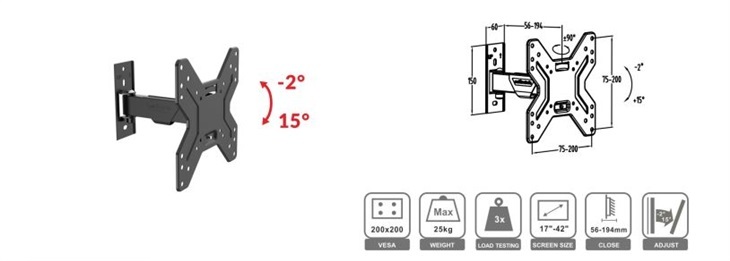 Držák na TV, VESA 200x200, maximální nosnost 25kg, vhodné pro úhlopříčky 17"-42", možnost nastavení vzdálenosti od zdi 56-194mm, przeczytaj całość