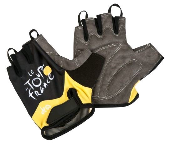 Oficiální rukavice a doplňkové zboží z katalogu produktů s logem a grafikou etapového cyklistického závodu Tour de France.
