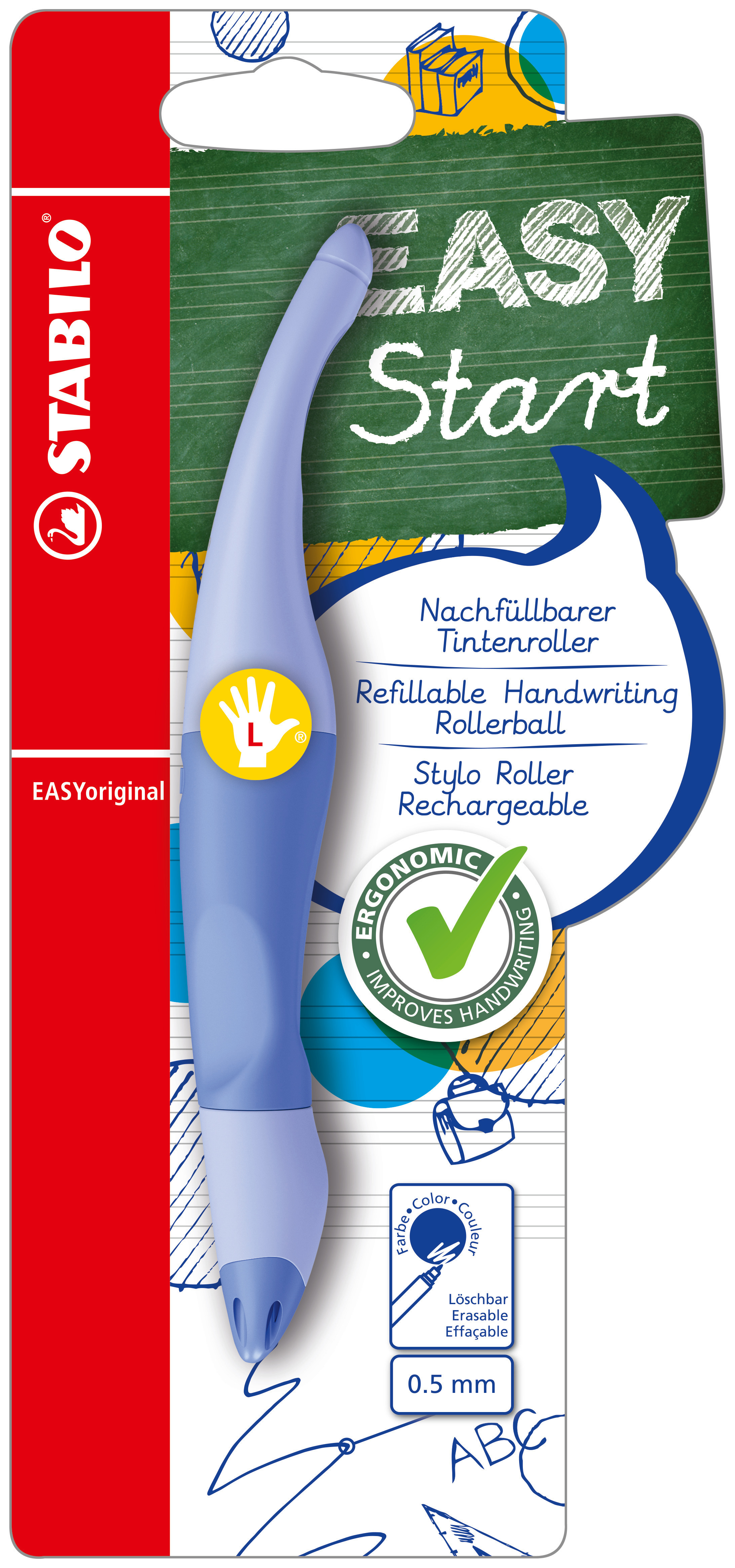 STABILO EASYoriginal Pastel wnosi modny pastelowy kolor do klas szkolnych. Ergonomiczny roller wraz z nabojem dla początkujących piszących i uczniów od 6. roku życia został opracowany w specjalnych wersjach dla leworęcznych i praworęcznych. Długopis z antypoślizgową strefą chwytu ergonomicznie leży w dłoni i wspiera odprężone trzymanie, które zapobiega przedwczesnemu zmęczeniu mięśni i napięciu podczas pisania. Łatwa obsługa umożliwia czyste i schludne pismo - bez plam, bez zarysowań. Do każdego nowego naboju dołączany jest nowy końcówka pisząca: łatwe uzupełnianie. Linia produktów STABILO EASYoriginal oferuje wybór naboi, z królewsko niebieskim ścieralnym atramentem do użytku szkolnego lub atramentem czarnym albo czerwonym. Wymienne naboje dostępne są w 2 grubościach linii: 0,3 mm (fine) w kolorze niebieskim do precyzyjnego pisania oraz 0,5 mm (medium) w kolorach niebieskim, czarnym i czerwonym. Zawiera również etykietę na imię. Skuwkę można nasunąć na koniec długopisu.