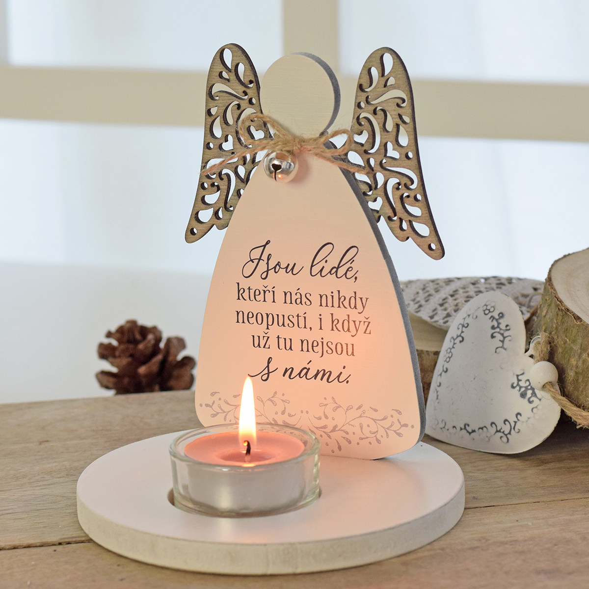 Dřevěný svícen ve tvaru anděla s krásným citátem. Pro někoho je anděl symbolem štěstí, ochrany, lásky nebo může být vzpomínkovým symbolem na ty, kteří už tu nemohou být s námi. Cena včetně skleněného svícnu na čajovou svíčku. velikost: 14,5 x 12,5 cm przeczytaj całość