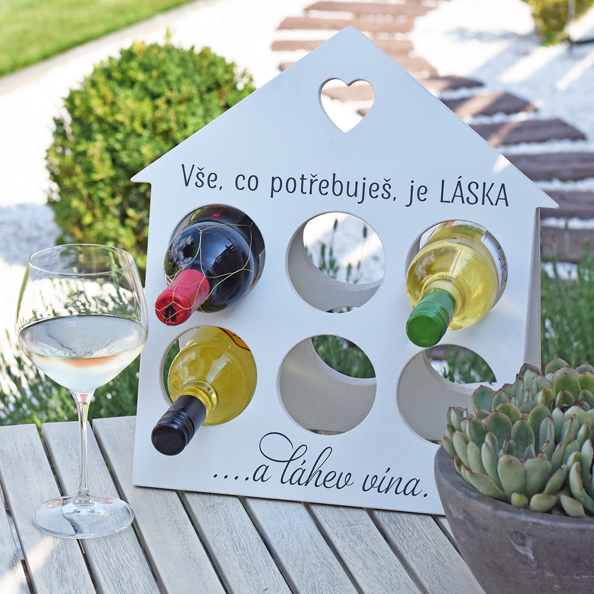 Pro milovníky vína tu máme specialitu. Dřevěný držák na víno. Jedinečný doplněk do interiéru s patřičným citátem. Díky kovovému pantu se dá složit. Je jištěn kovovým hákem.Skvělý tip na dárek.Držák na víno je vhodný pro 6 lahví. velikost: 40 x 36,5 cm, hloubka spodní části: 17 cm przeczytaj całość