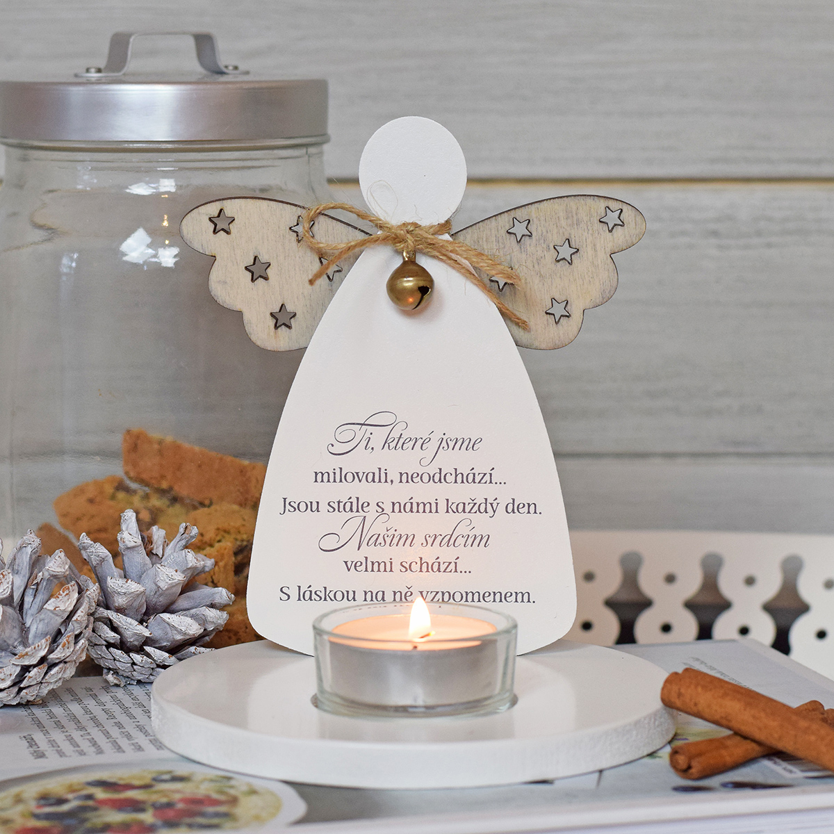 Svícen anděl - Vzpomínky Dřevěný svícen ve tvaru anděla s citátem pro ty, kteří rádi vzpomínají na své blízké.Skleněný kalíšek ani svíčka nejsou součástí produktu. velikost: 14,5 x 12,5 cm przeczytaj całość