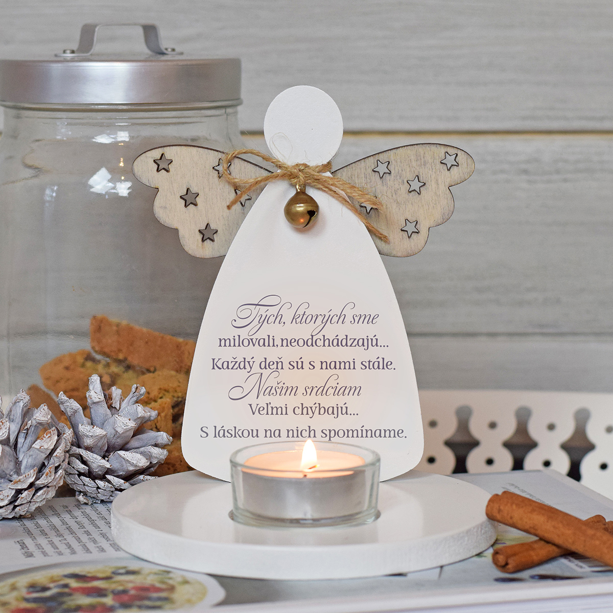 Dřevěný svícen ve tvaru anděla s citátem pro ty, kteří rádi vzpomínají na své blízké.Skleněný kalíšek ani svíčka nejsou součástí produktu. velikost: 14,5 x 12,5 cm przeczytaj całość