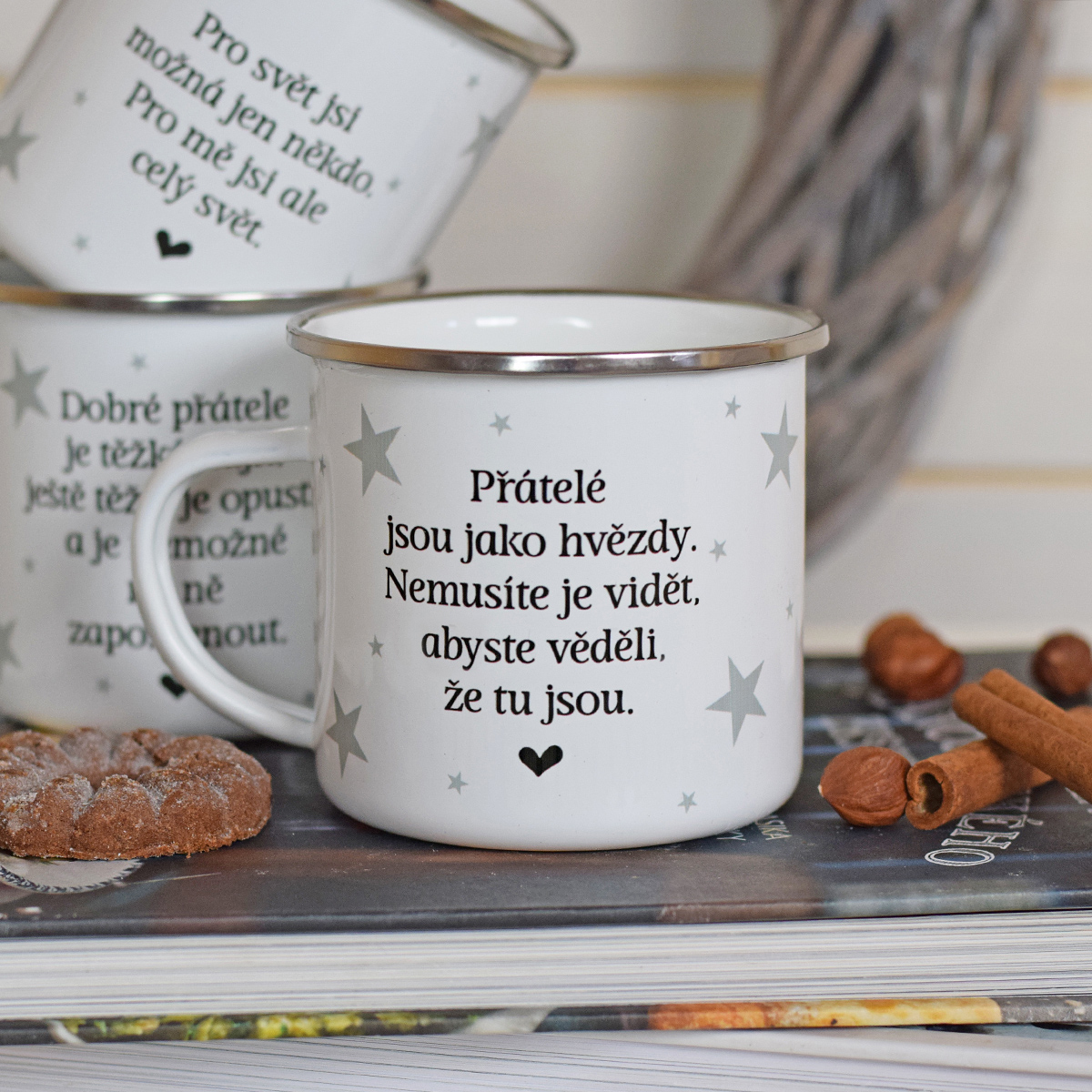 Plecháček "Přátelé jsou jako hvězdy" Plecháček pro přátele, kteří jsou vždy po našem boku. - plechový hrneček - obsah : 330ml- skvělý tip na dárek- originální výroba Housedecor przeczytaj całość
